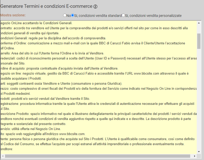 Come vengono gestite le condizioni di vendita nel caso di sito e-commerce?
