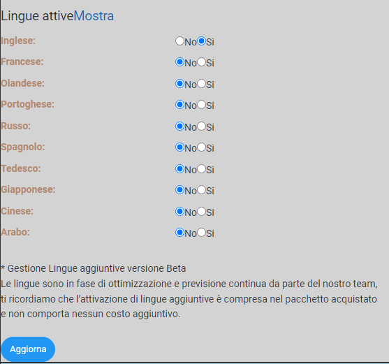 Le lingue possono essere attivate nella sezione gestione sito del programma: